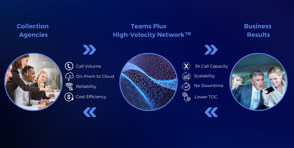 With the Teams Plus High-Velocity Network™, built specifically for collections agencies, you can scale your outbound call volumes by 3X—quickly, reliably, and efficiently. This purpose-built solution allows you to handle high call demands seamlessly while lowering costs and eliminating downtime.